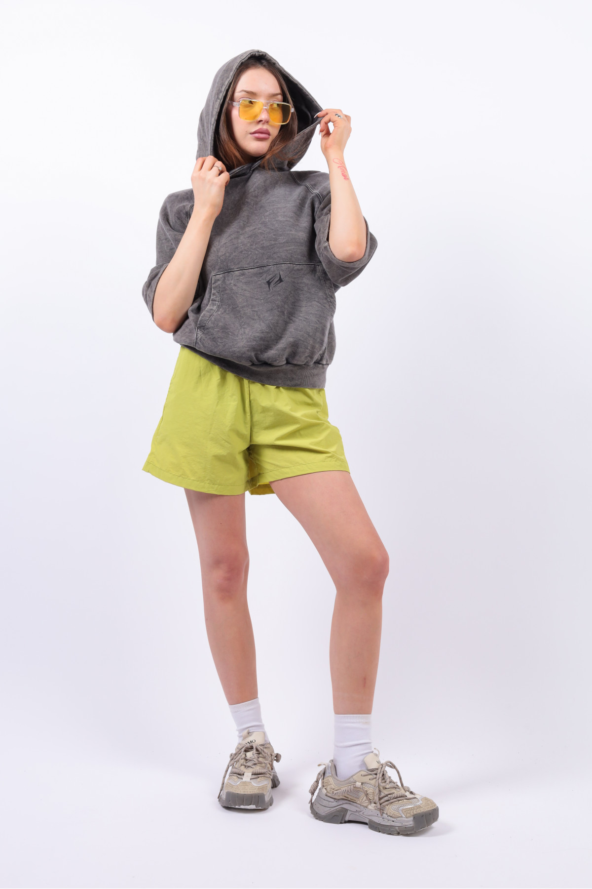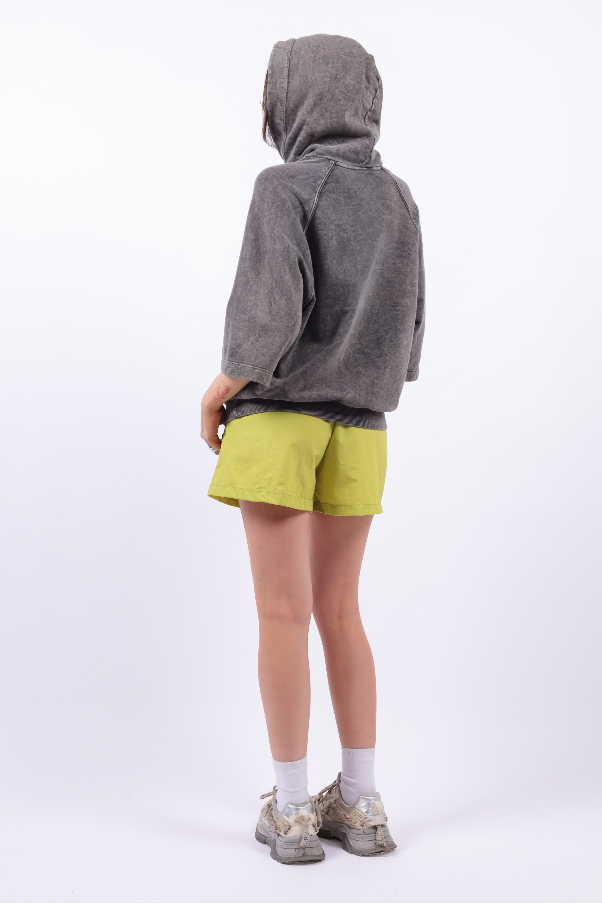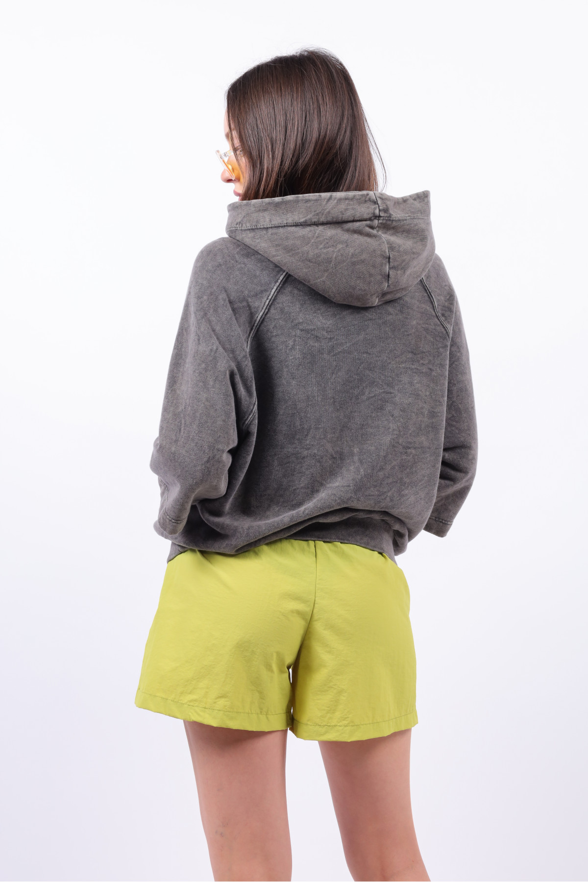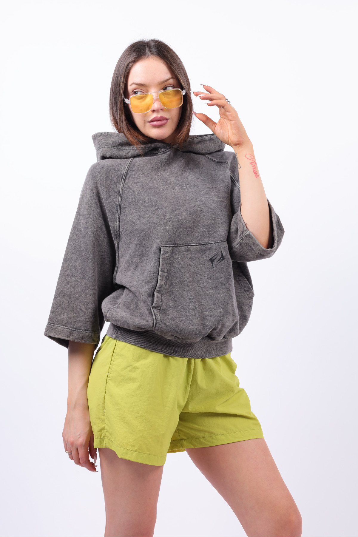 Buzo manga ranglan corta y capucha con logo. Lavado acid