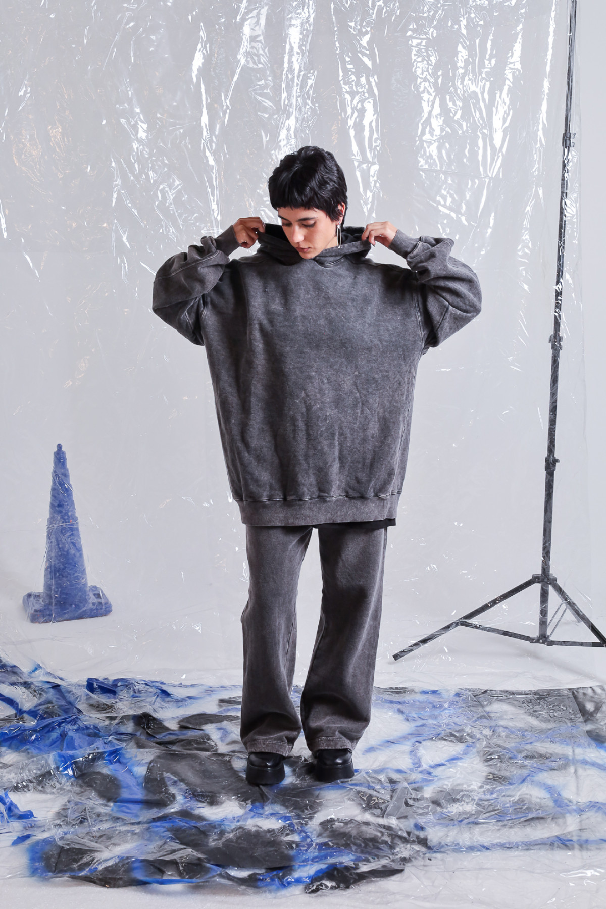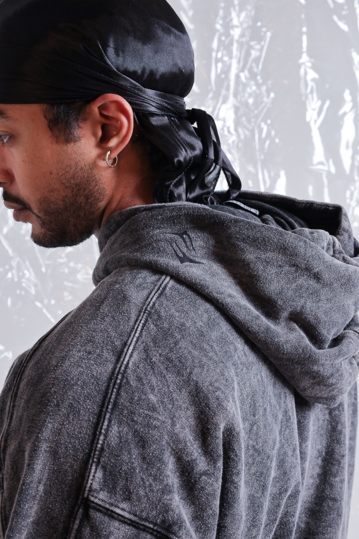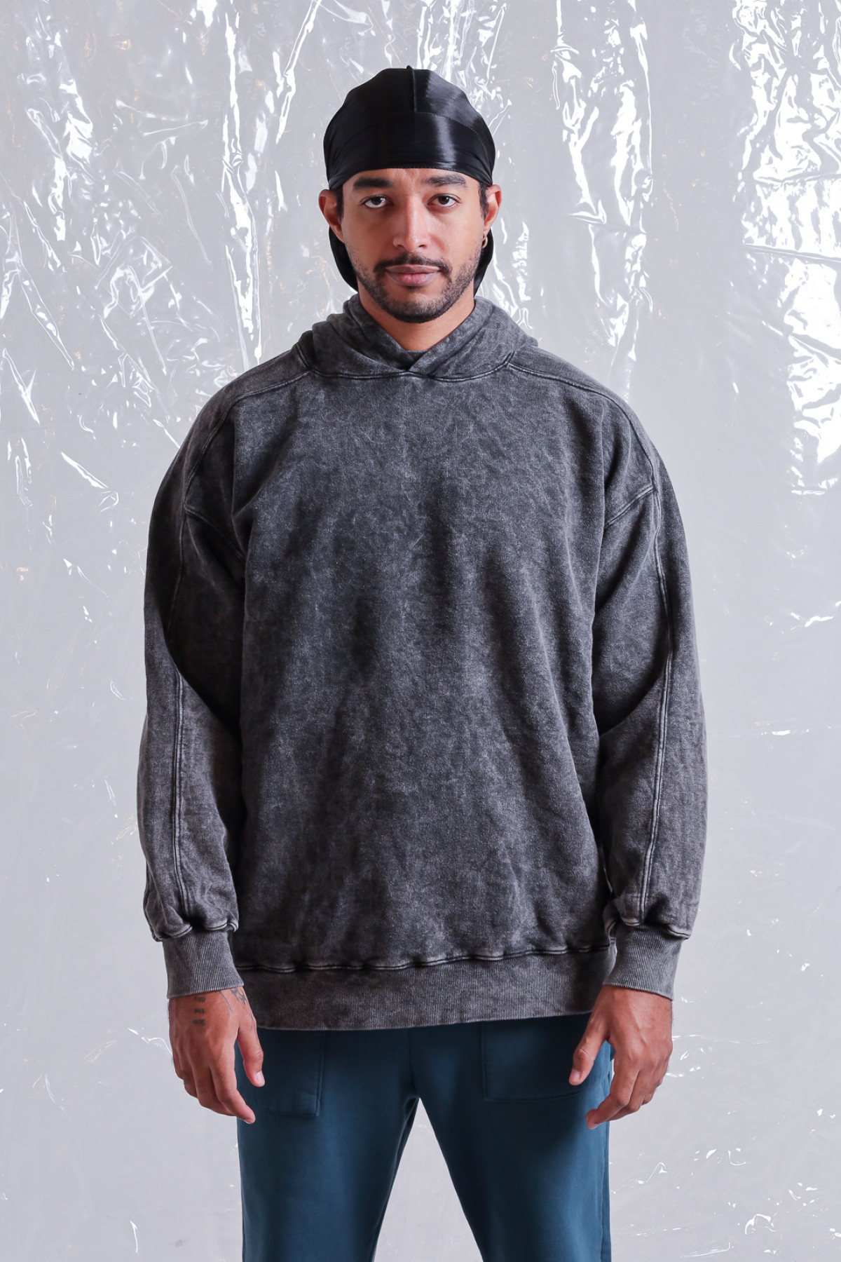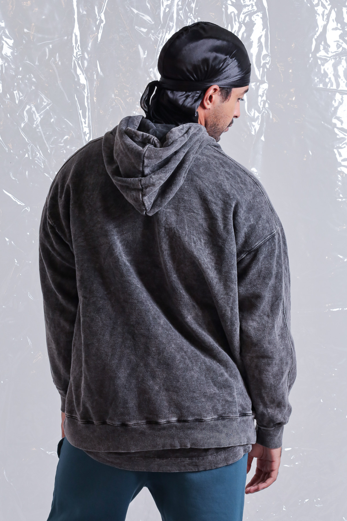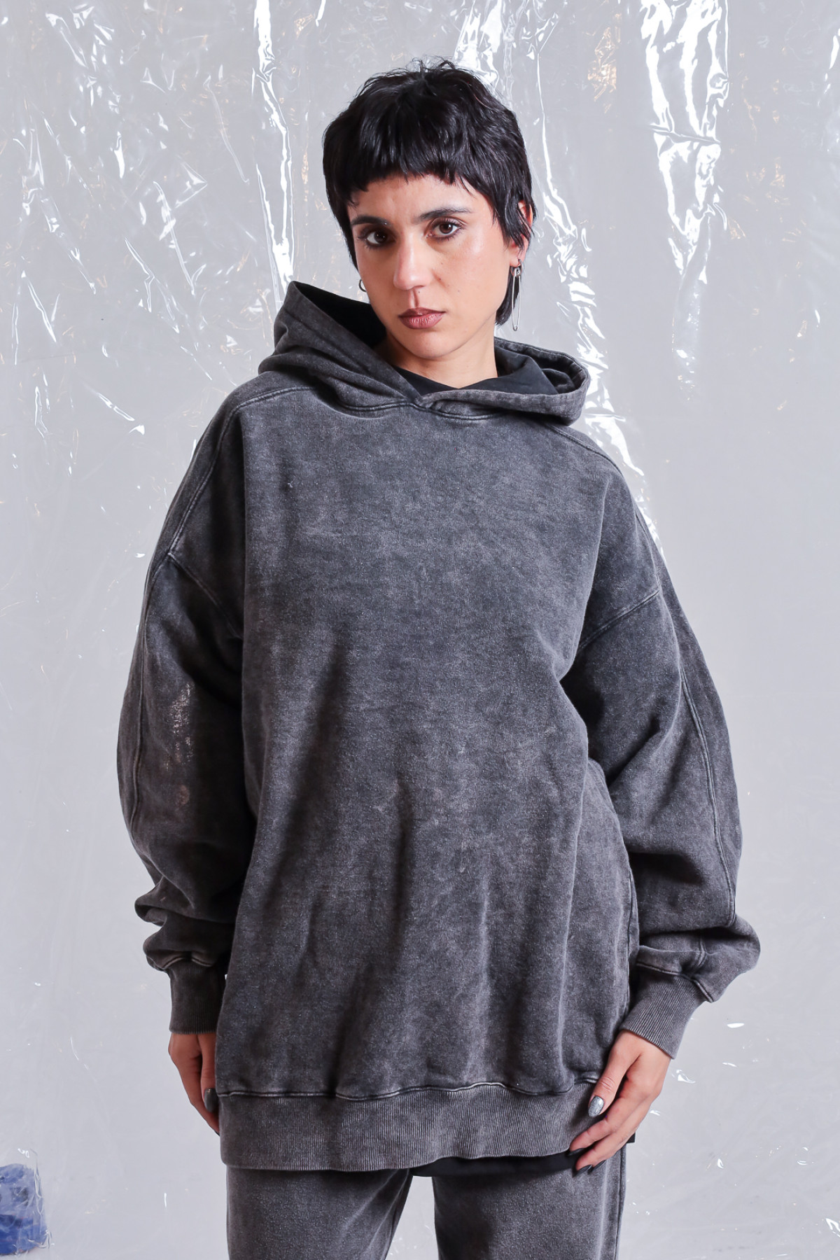 Buzo rústico lavado acid, con recortes y capucha con logo