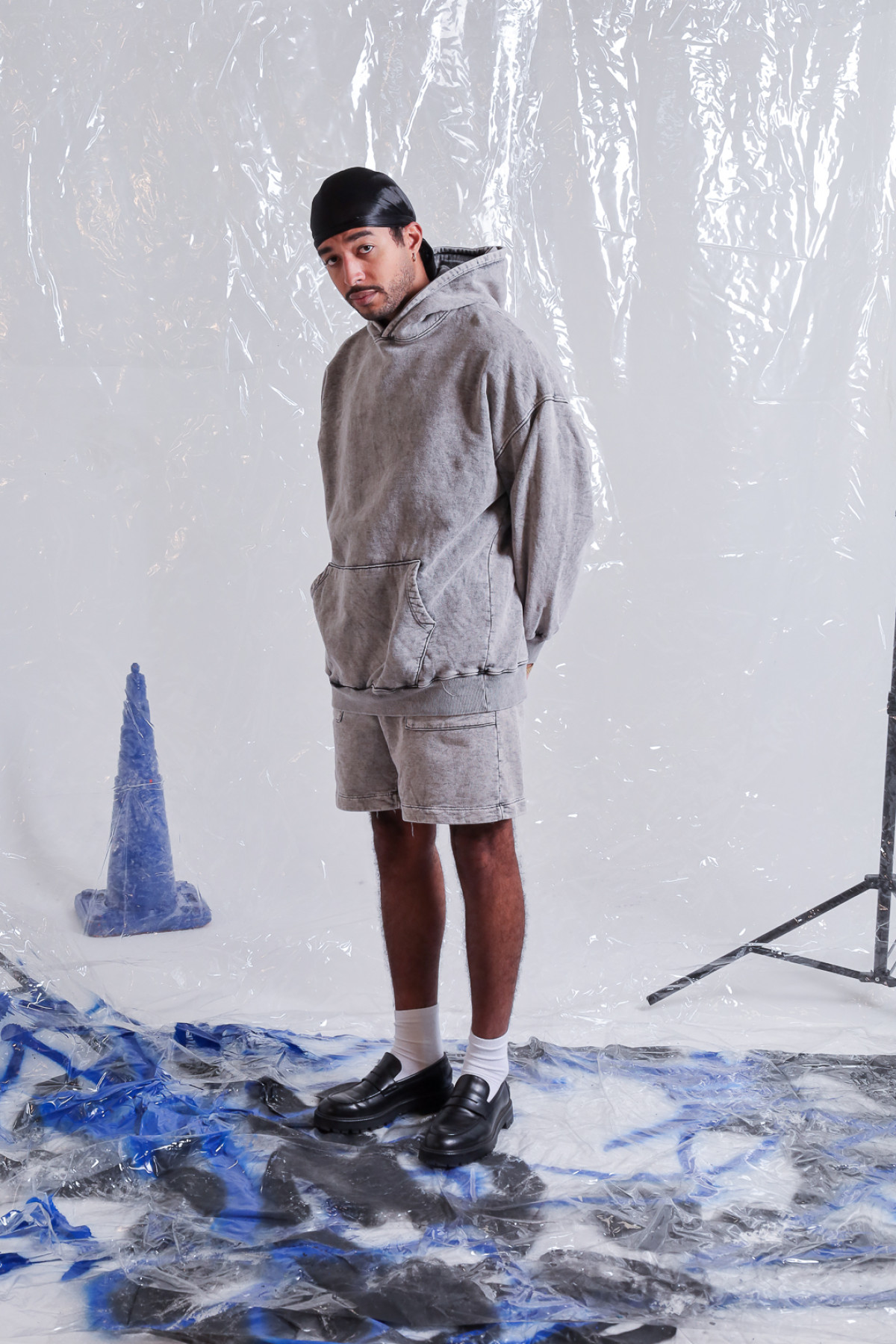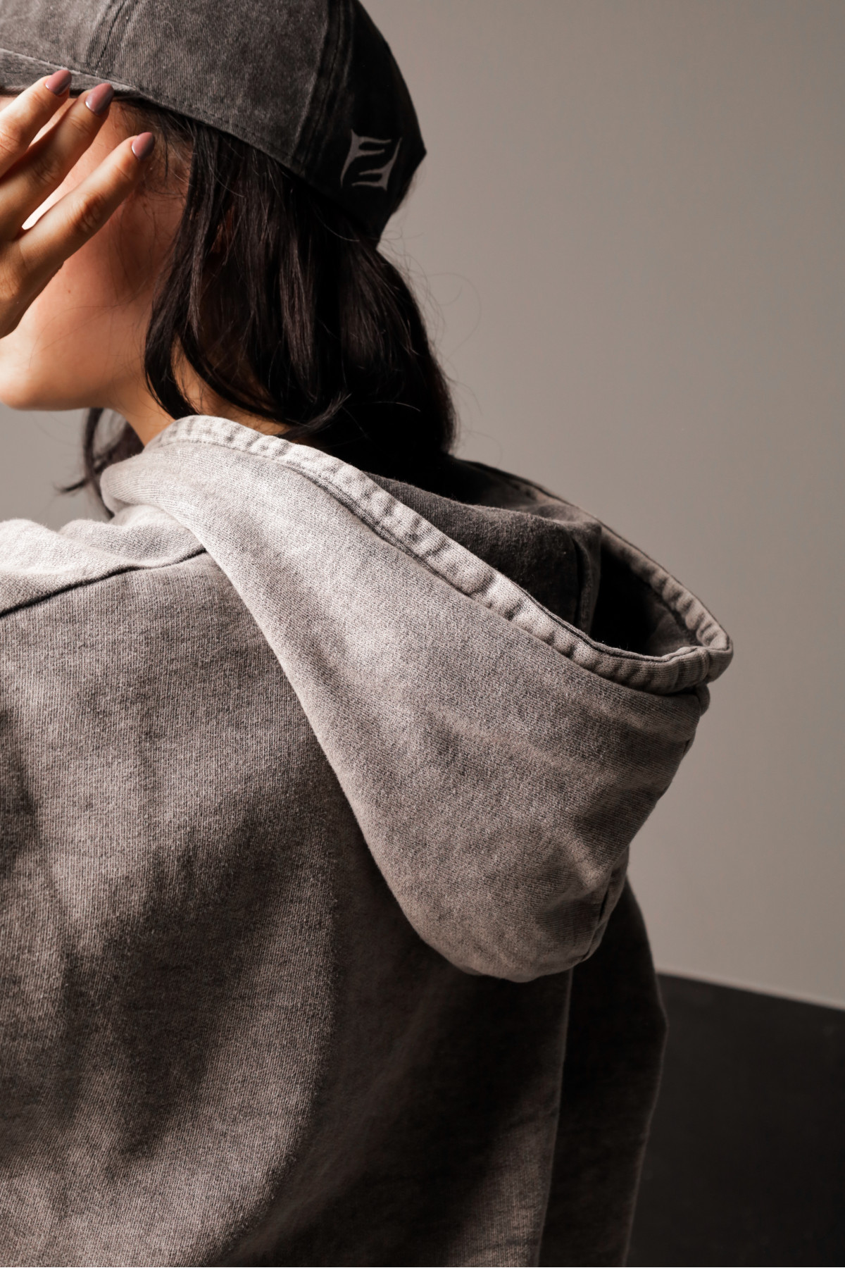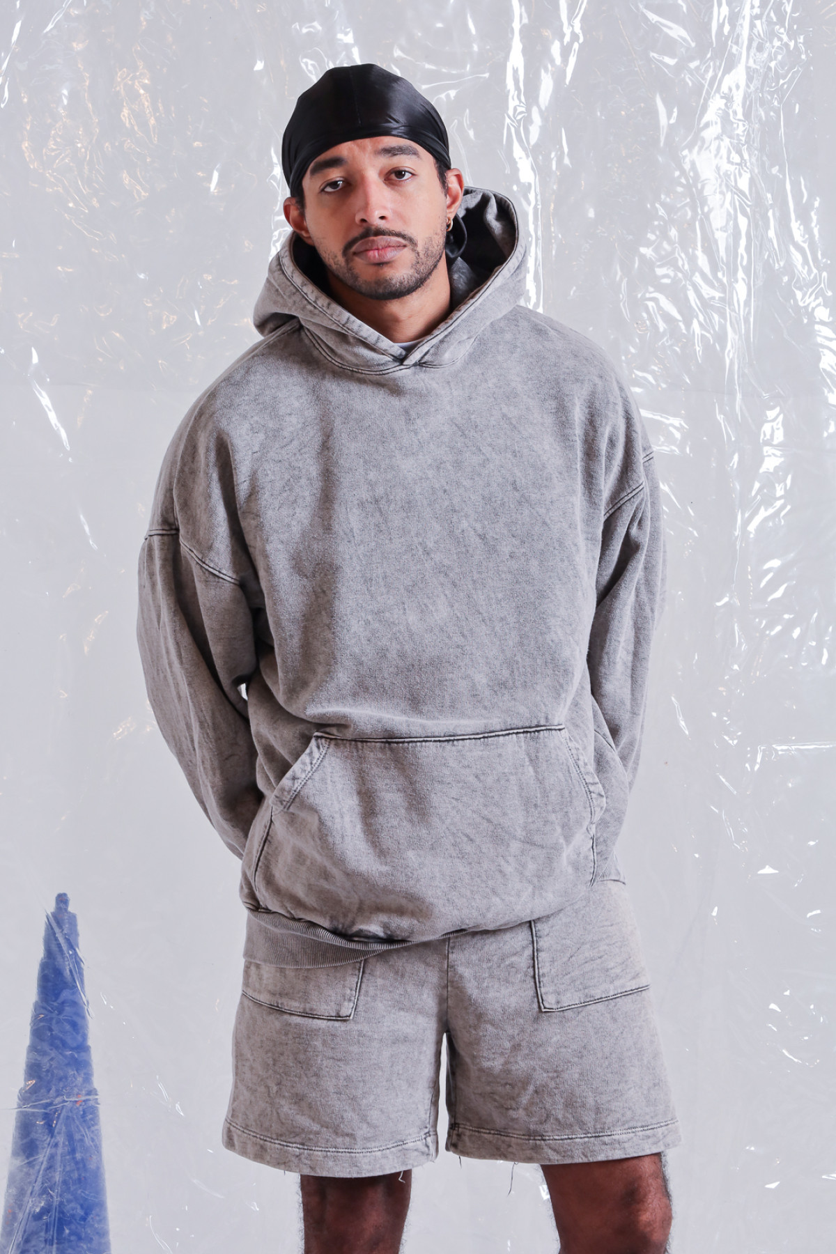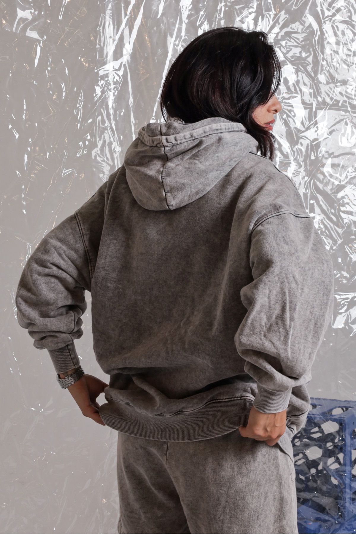 Buzo de frisa, corte oversize, con bolsillo canguro y capucha. Lavado ice