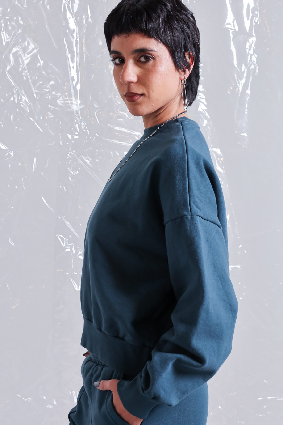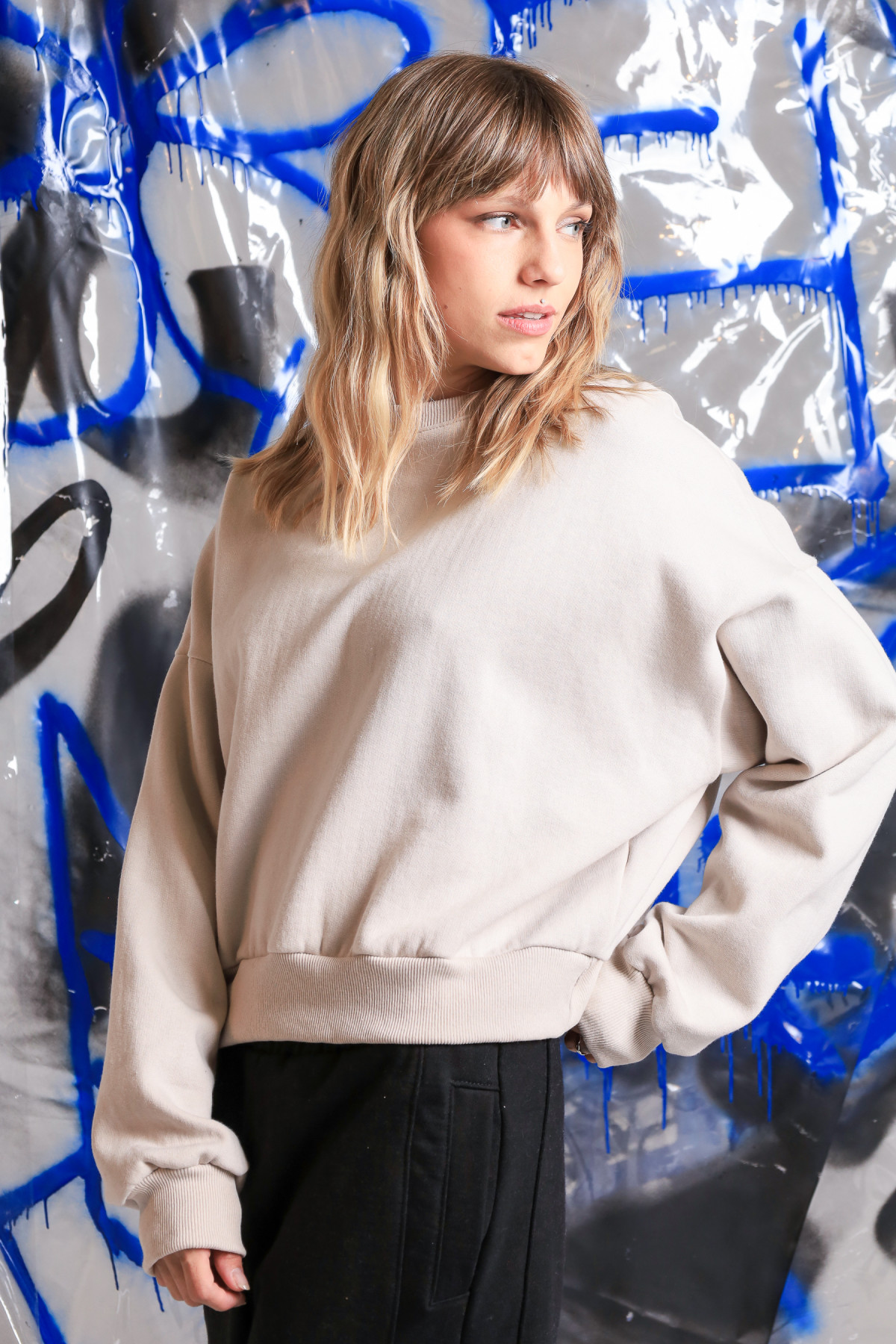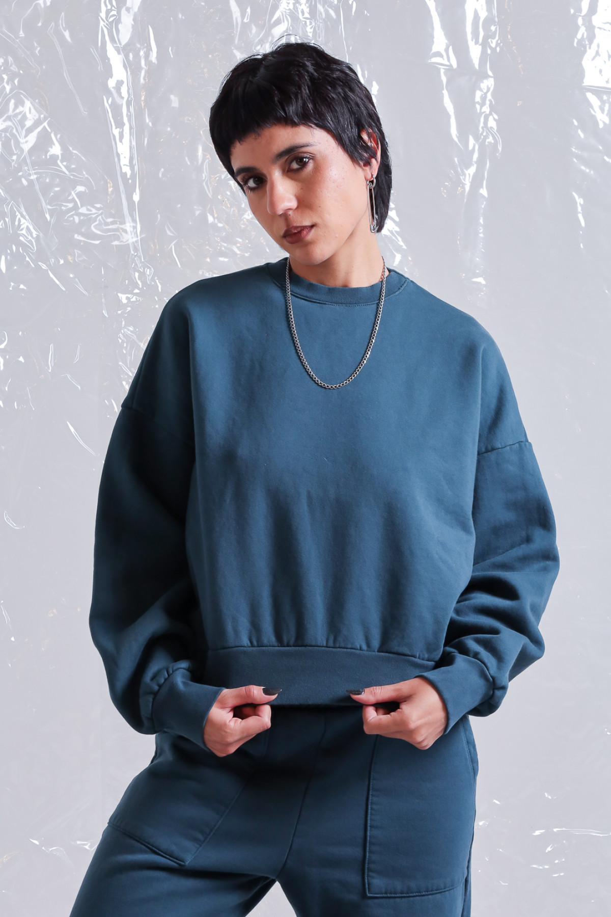 Buzo de frisa oversize, corto a la cintura, con ribb